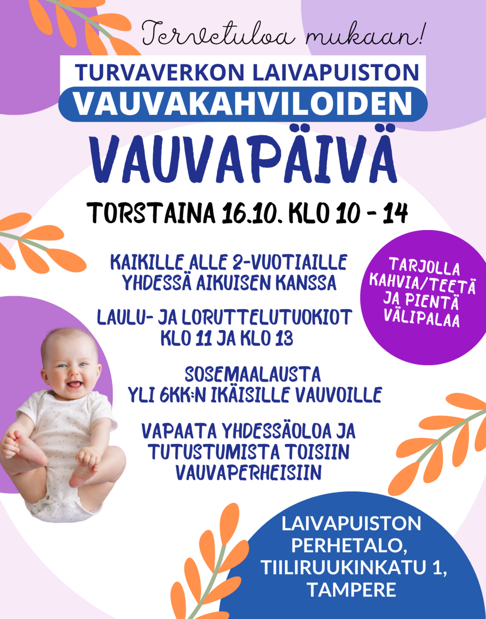 Tervetuloa viettämään Turvaverkon vauvakahviloiden Vauvapäivää torstaina 16.10. klo 10 - 14 Laivapuiston perhetalolle! Vauvapäivänä ovet ovat auki klo 10 - 14 ja voit tulla ja mennä omien…