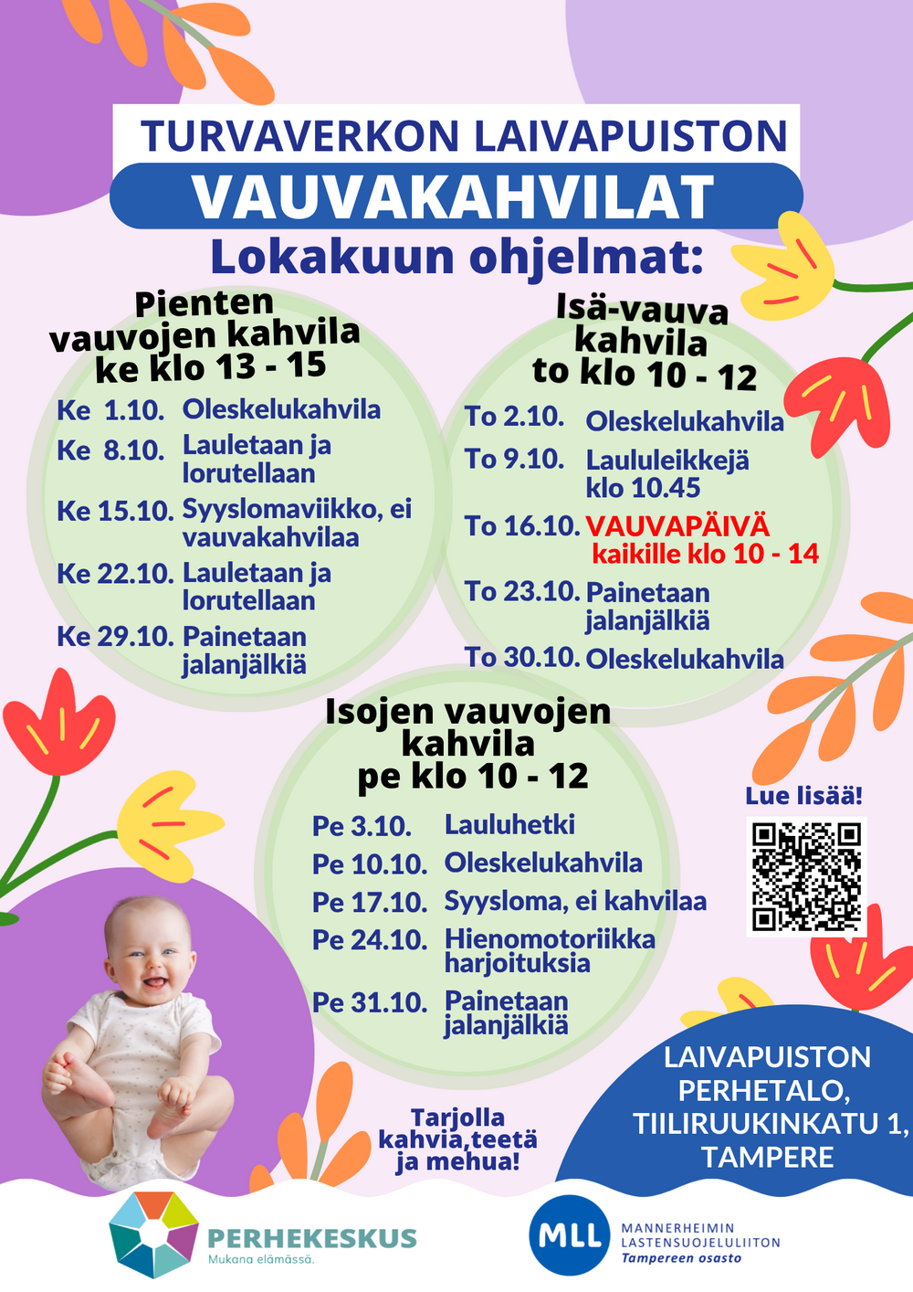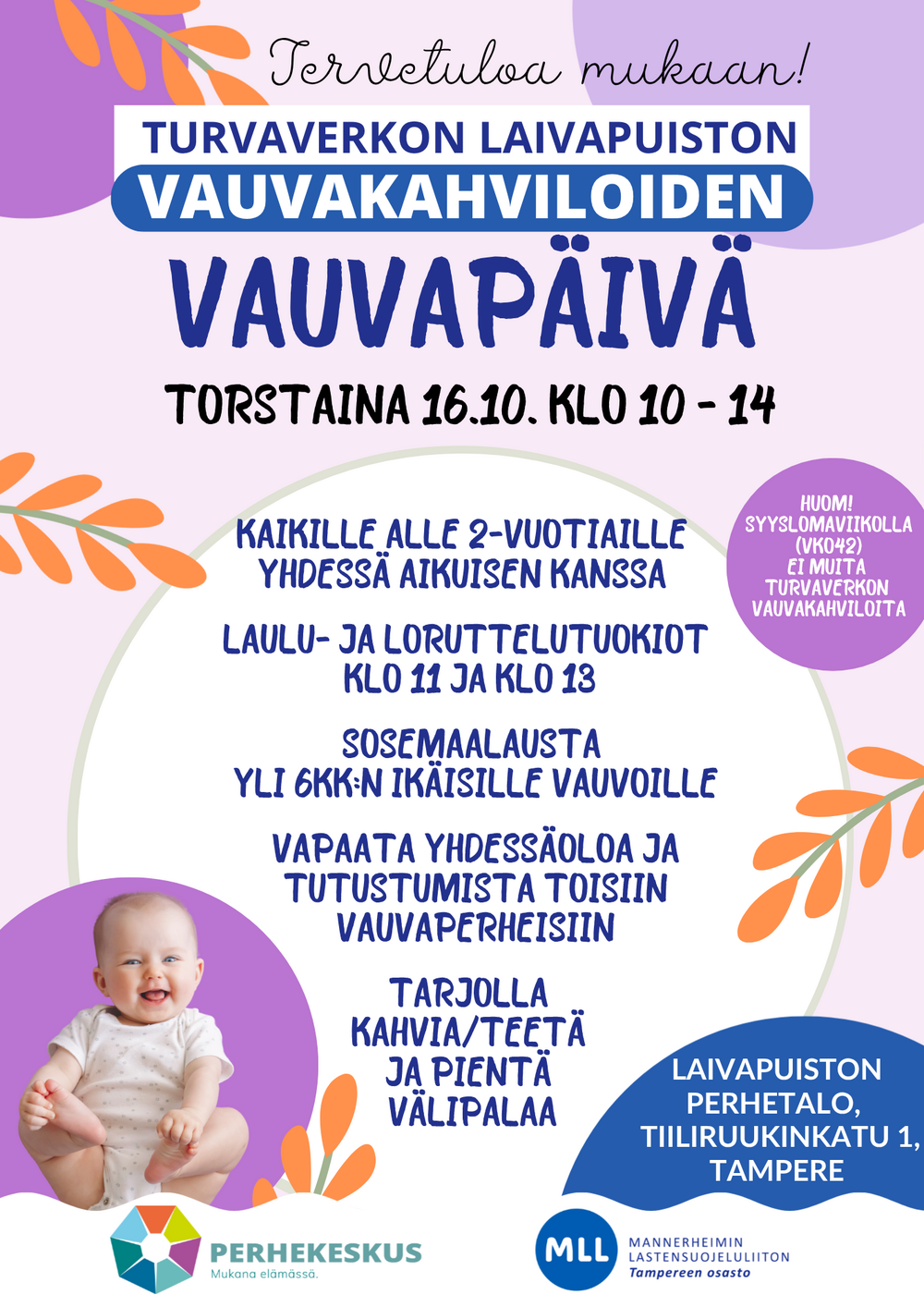 Huom! Lokakuussa syyslomaviikolla (vk42) pidämme Vauvapäivän torstaina 16.10. klo 10 - 14 Laivapuiston perhetalolla. Tuolla viikolla ei ole pienten vauvojen, isojen vauvojen eikä isä-vauva-kahvilaa, mutta kaikki ovat tervetulleita torstaina silloin kun sinulle sopii klo 10 - 14 välillä. Vauvapäivän ohjelma julkaistaan pian!